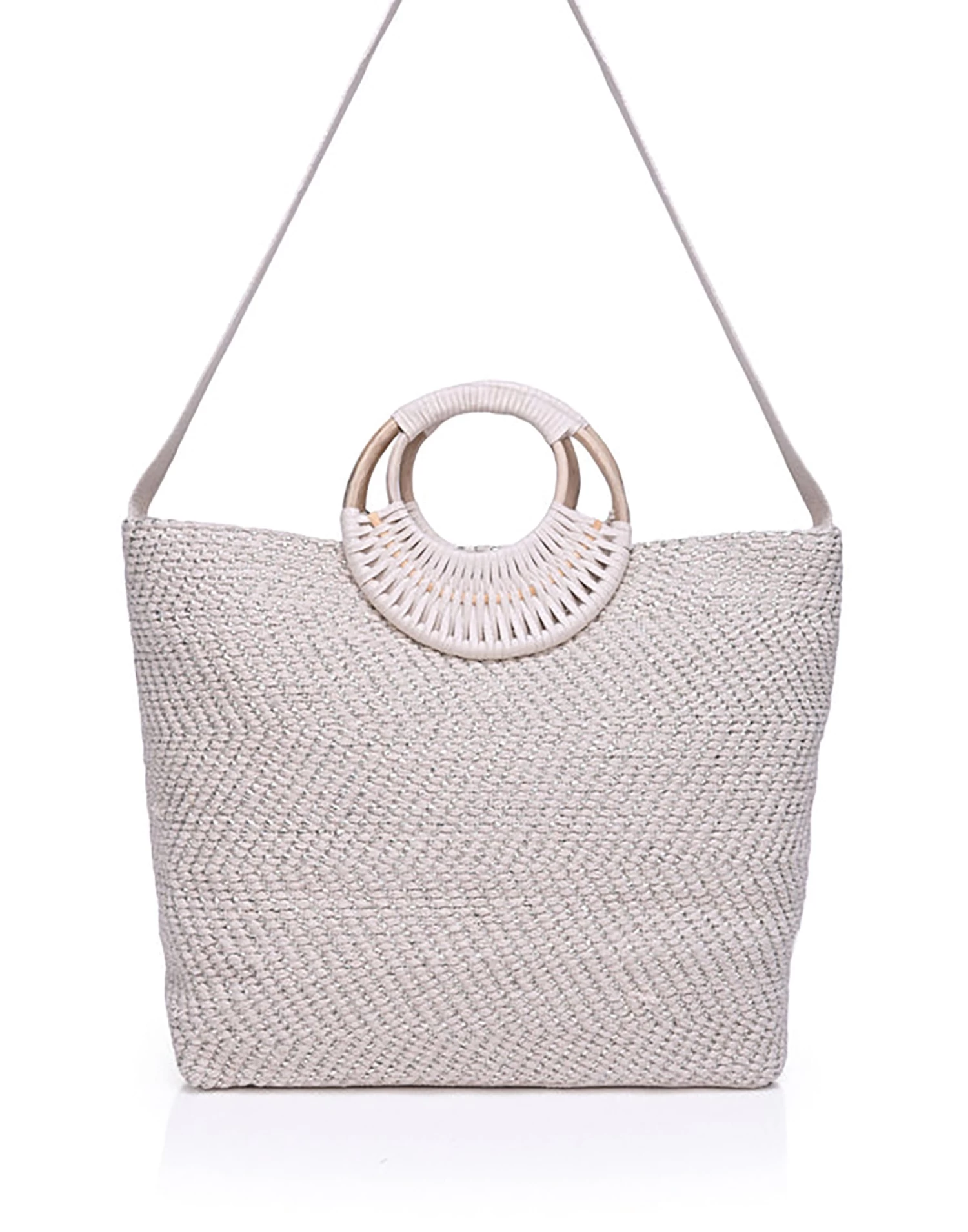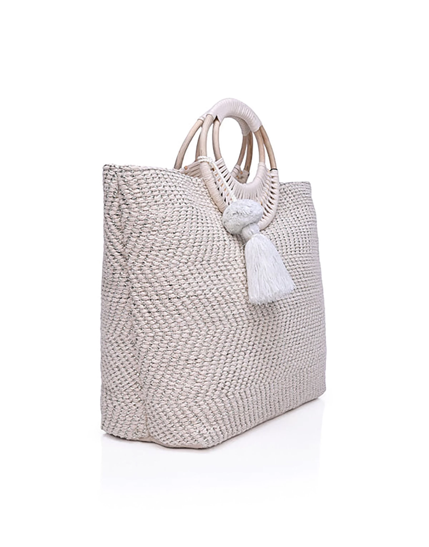 A must-have in the wardrobe, this handheld tote features lurex and tassel details.