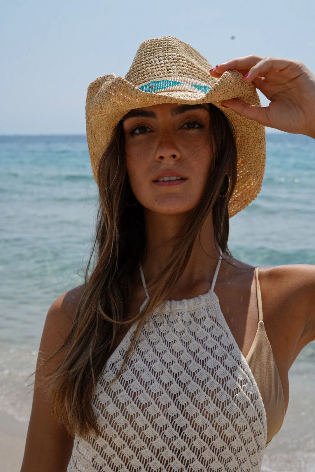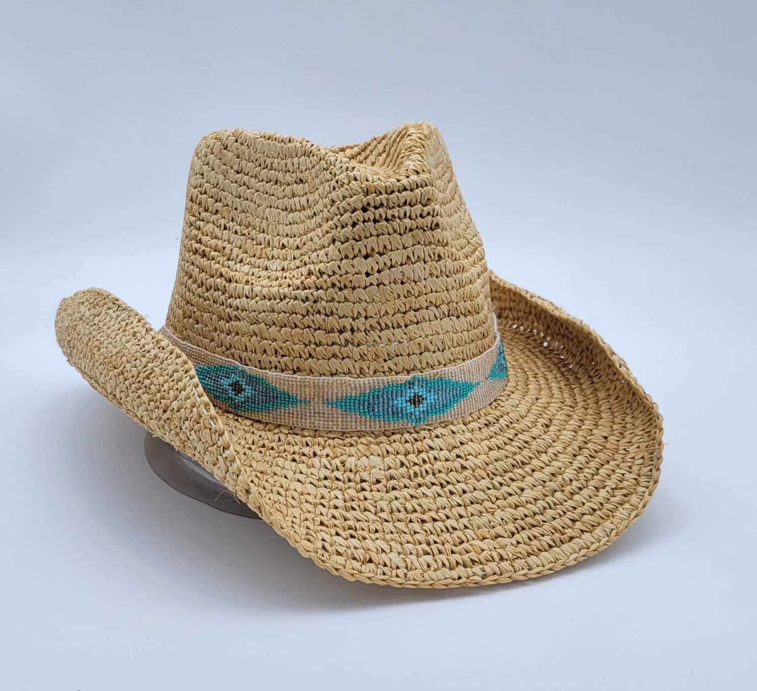 UP40+ , 4” Brim, Crochet Raffia Cowgirl with Beaded Trim