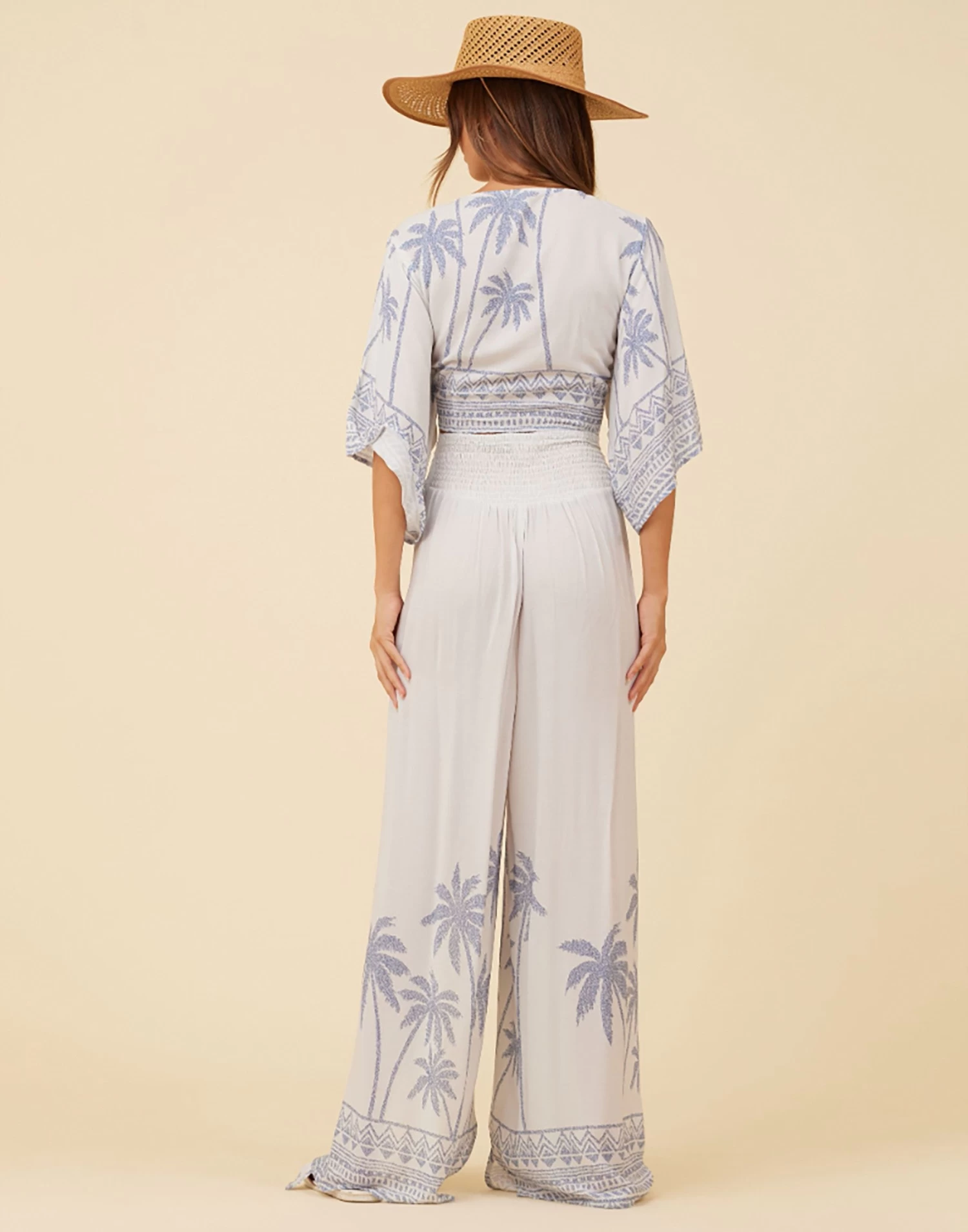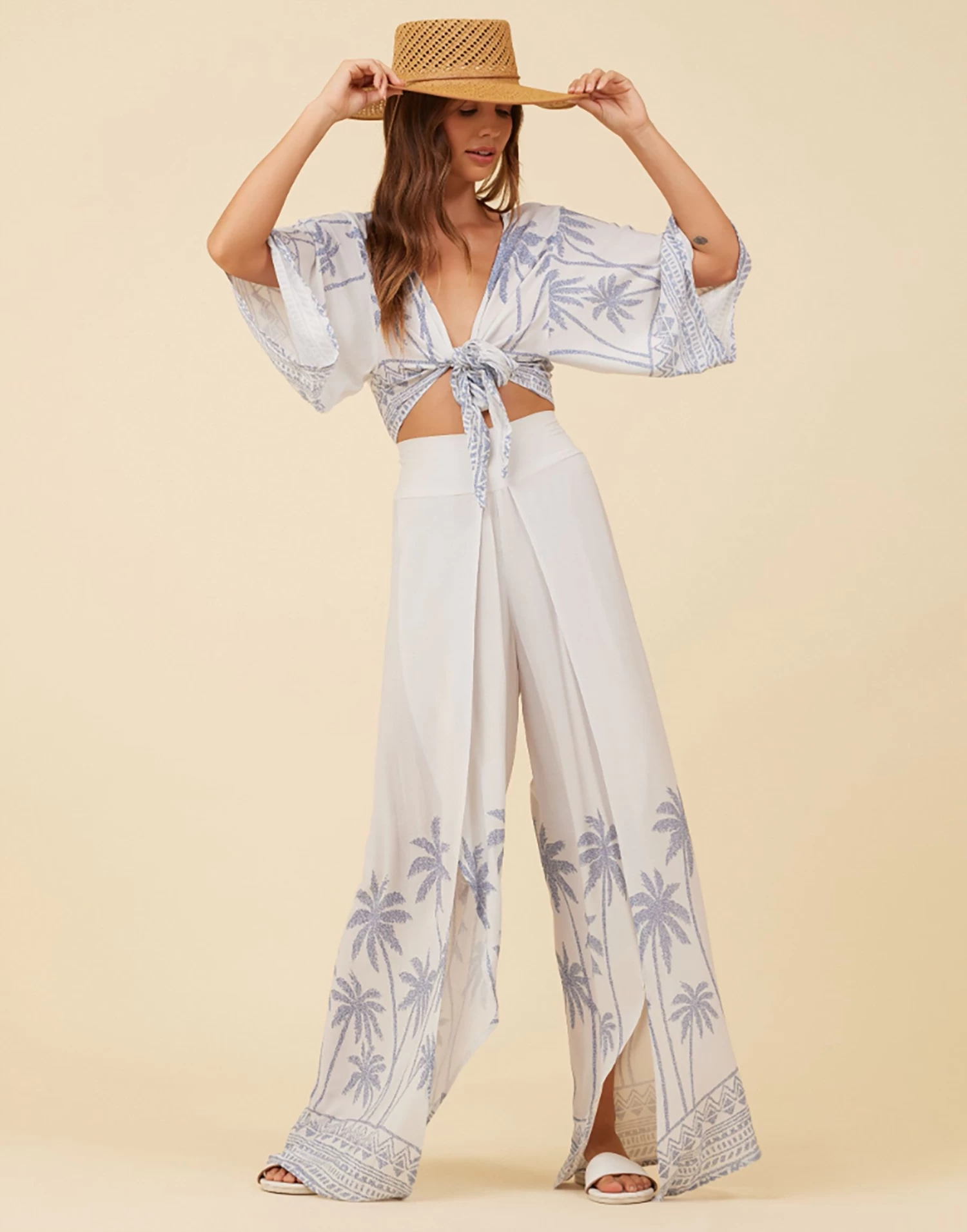 The Cabo Palm Print Pant has a wide leg fit and elastic waistband featuring front slits. Complete the look by pairing it with the Cabo Palm Tie Front Top.