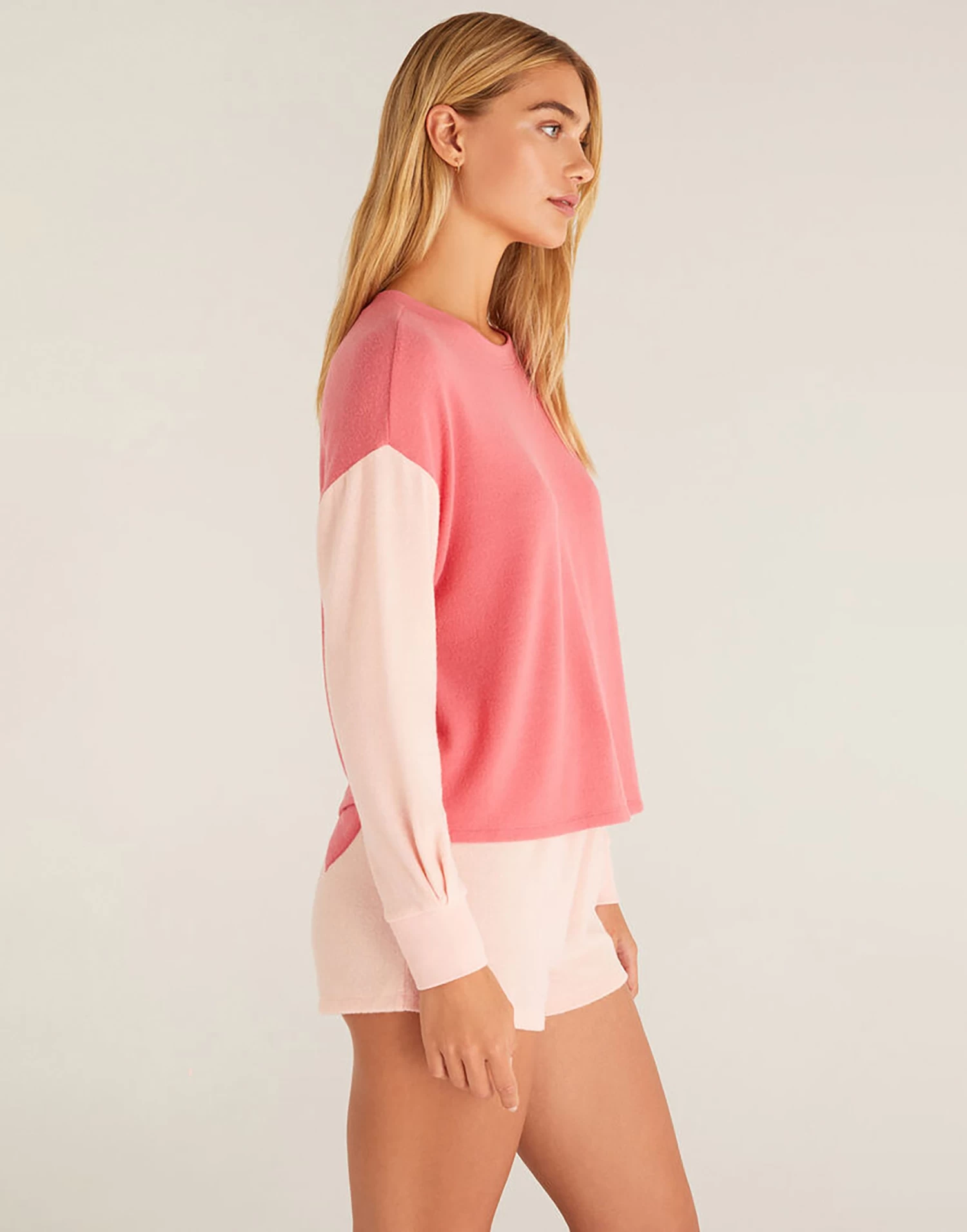 Simple, soft, and so comfortable! The Color Block Long Sleeve Top is made using the coziest Brushed Sweater Knit fabric and features a relaxed, cropped fit that hits at the waistband. This crew neck pullover has a contrast color at the sleeves and makes the cutest set with the Lover Heart Short and coordinates with the Sweetie Brushed Jogger.