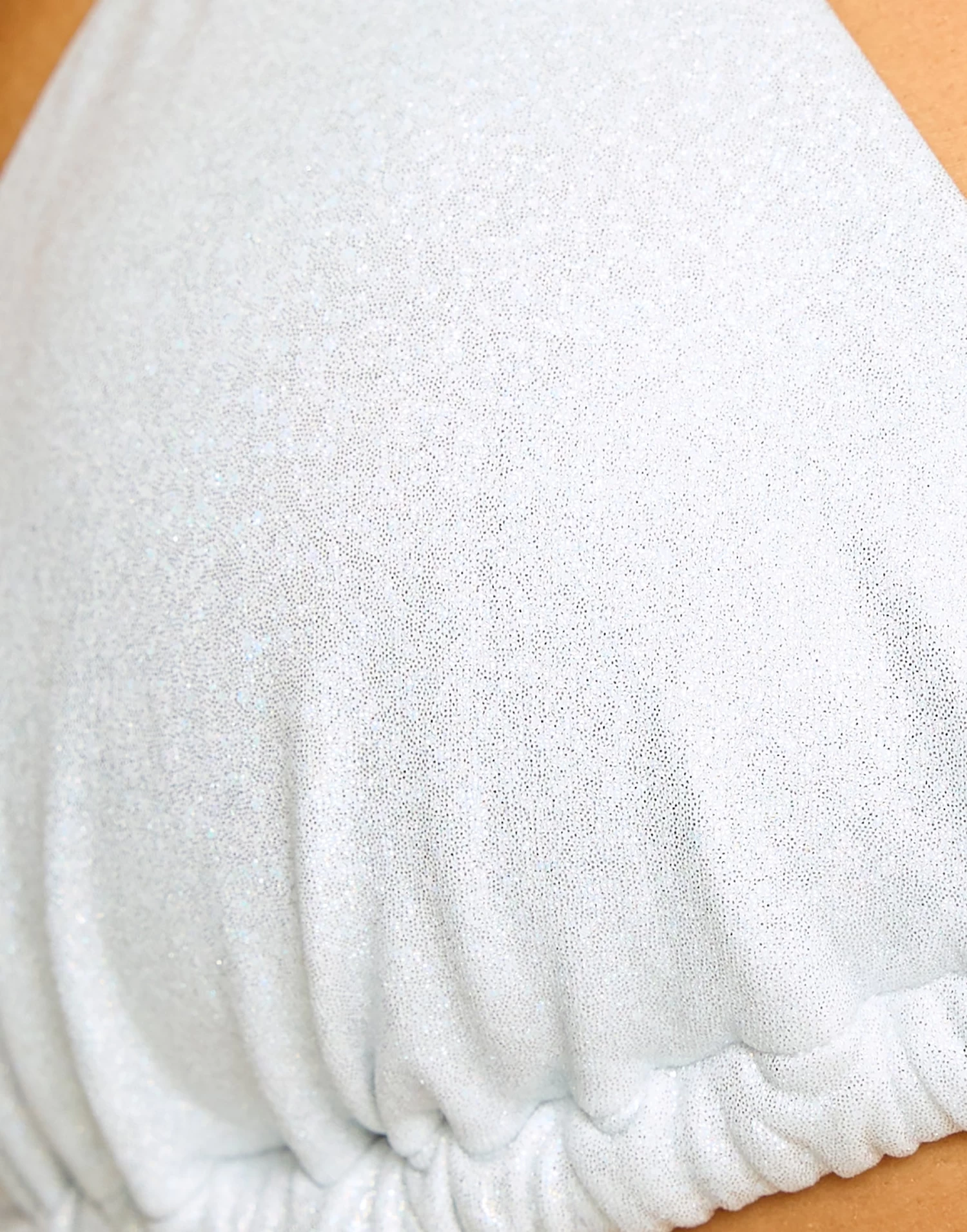 Shine bright in the Devan Triangle Top! This bikini top features a shimmery fabric, gorgeous rhinestone embellished hardware and strings that wrap in the front and back for a crisscross detail. Â