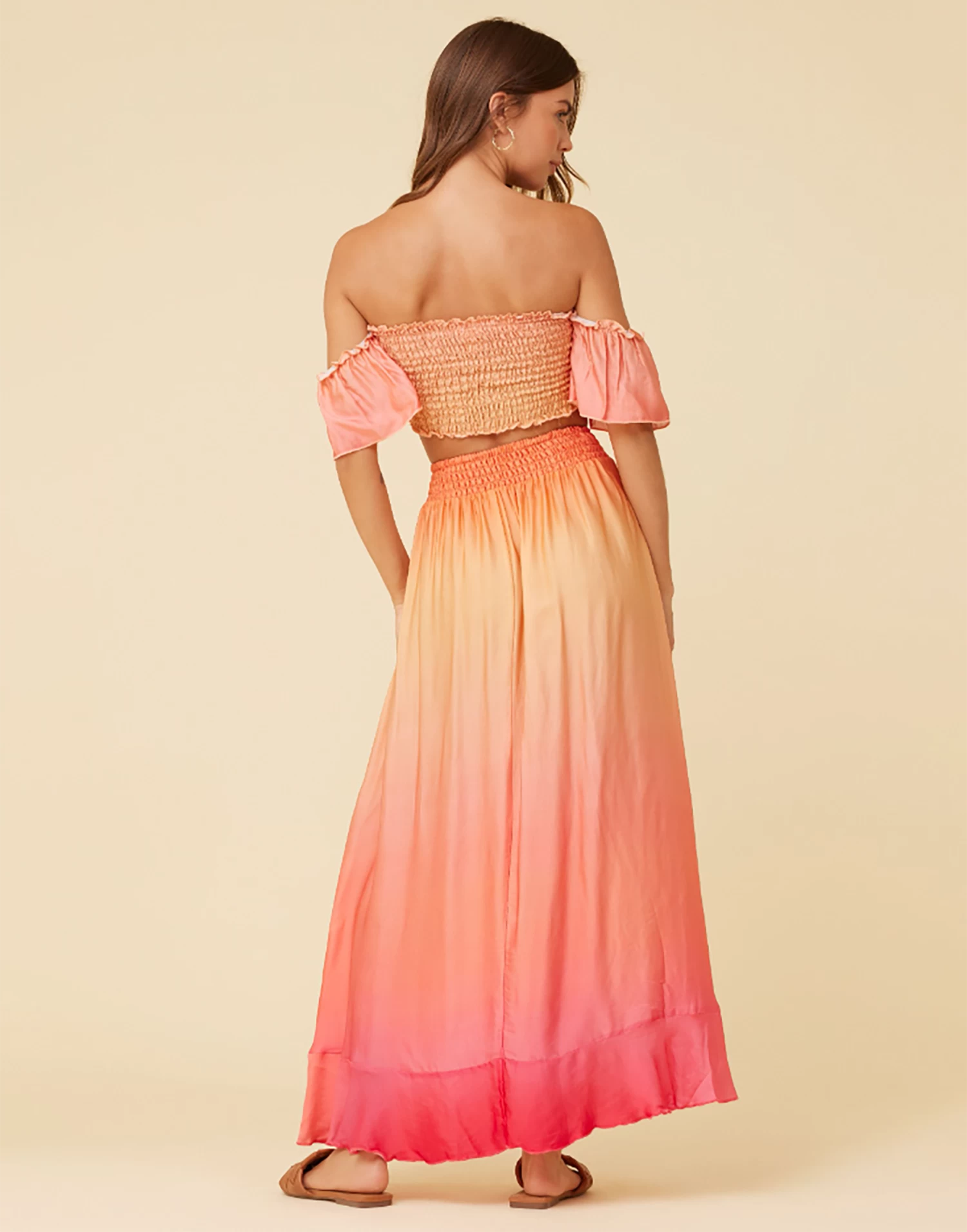 The Sunset Ombre Dip Dye Satin Tie Front Off the Shoulder Crop Top features a front knot tie and smocked details.