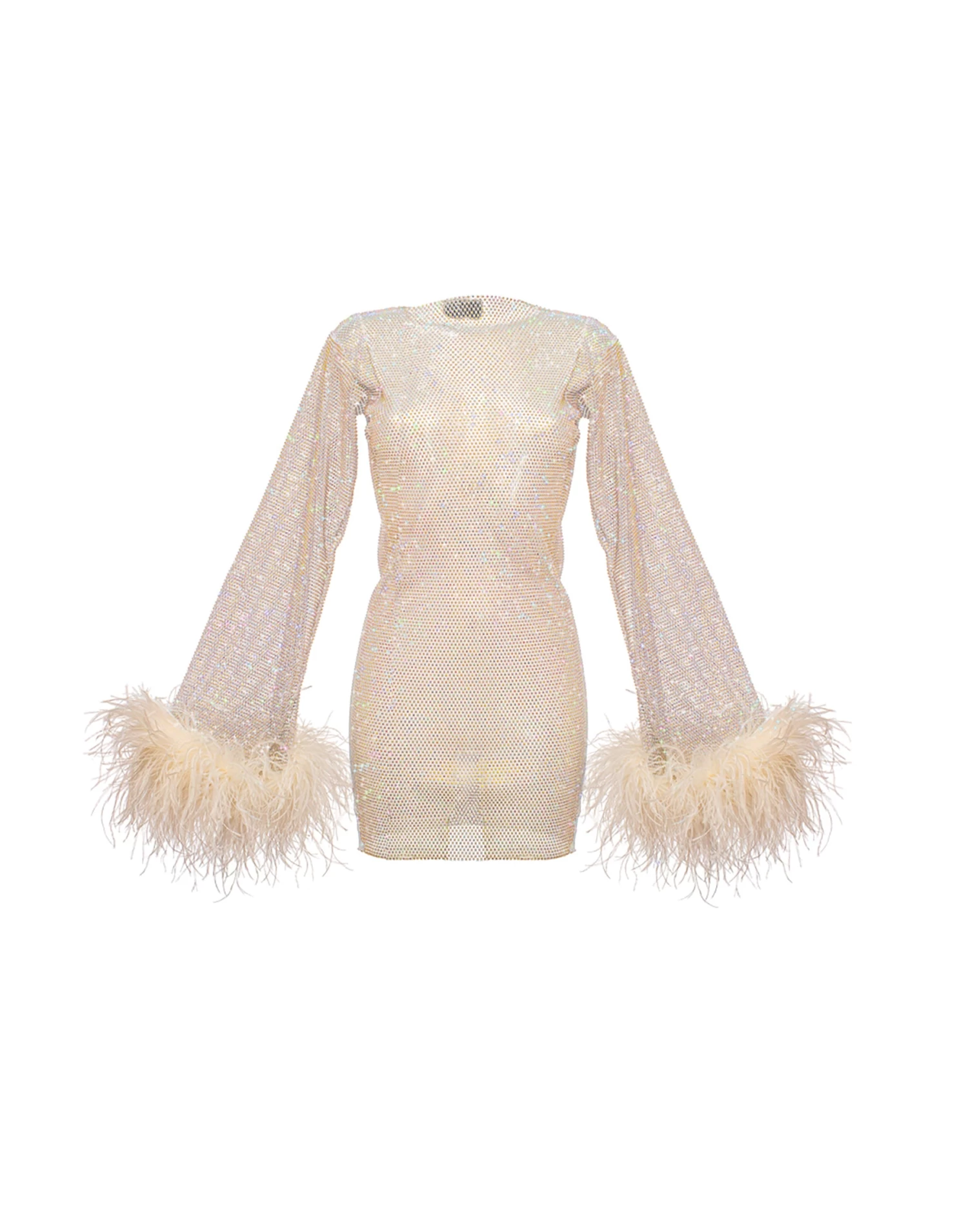 Feathers Mini Dress with wide sleeves, complemented by an ostrich feather. Made of open knit fabric with rhinestone embellishments throughout.