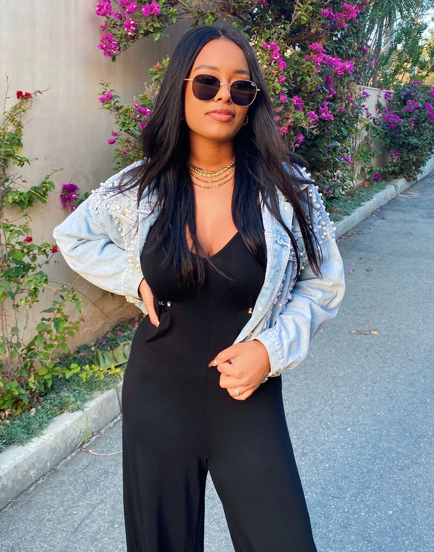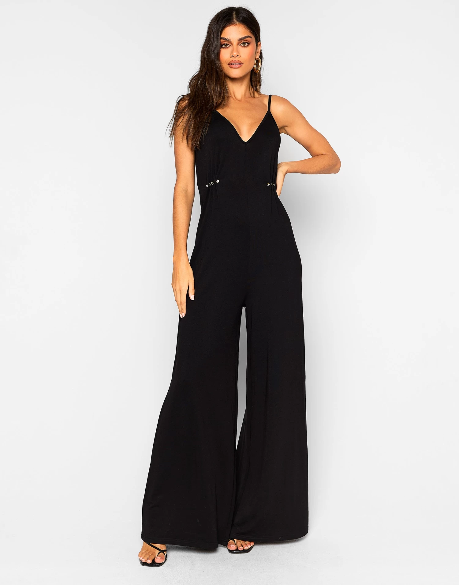 The Jesse Wide Leg Jumpsuit has a v-neck and features rhinestone trim details. This jumpsuit will have you feeling great whether it’s lounging at home or an evening out.Â