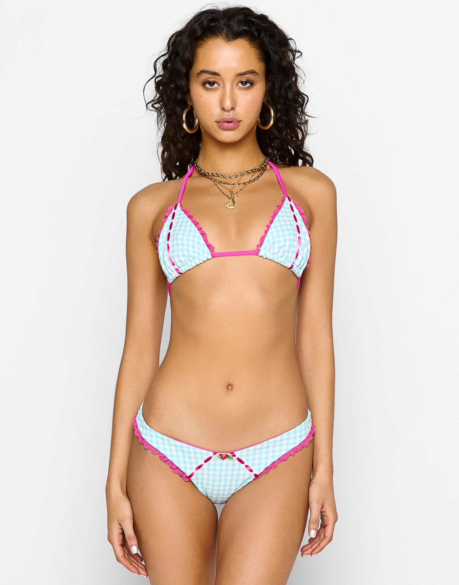 The Karissa Tango Bottom takes on a new twist to a Beach Bunny classic. It features a cute flower trim along with ribbon and lace ruffle details.Â