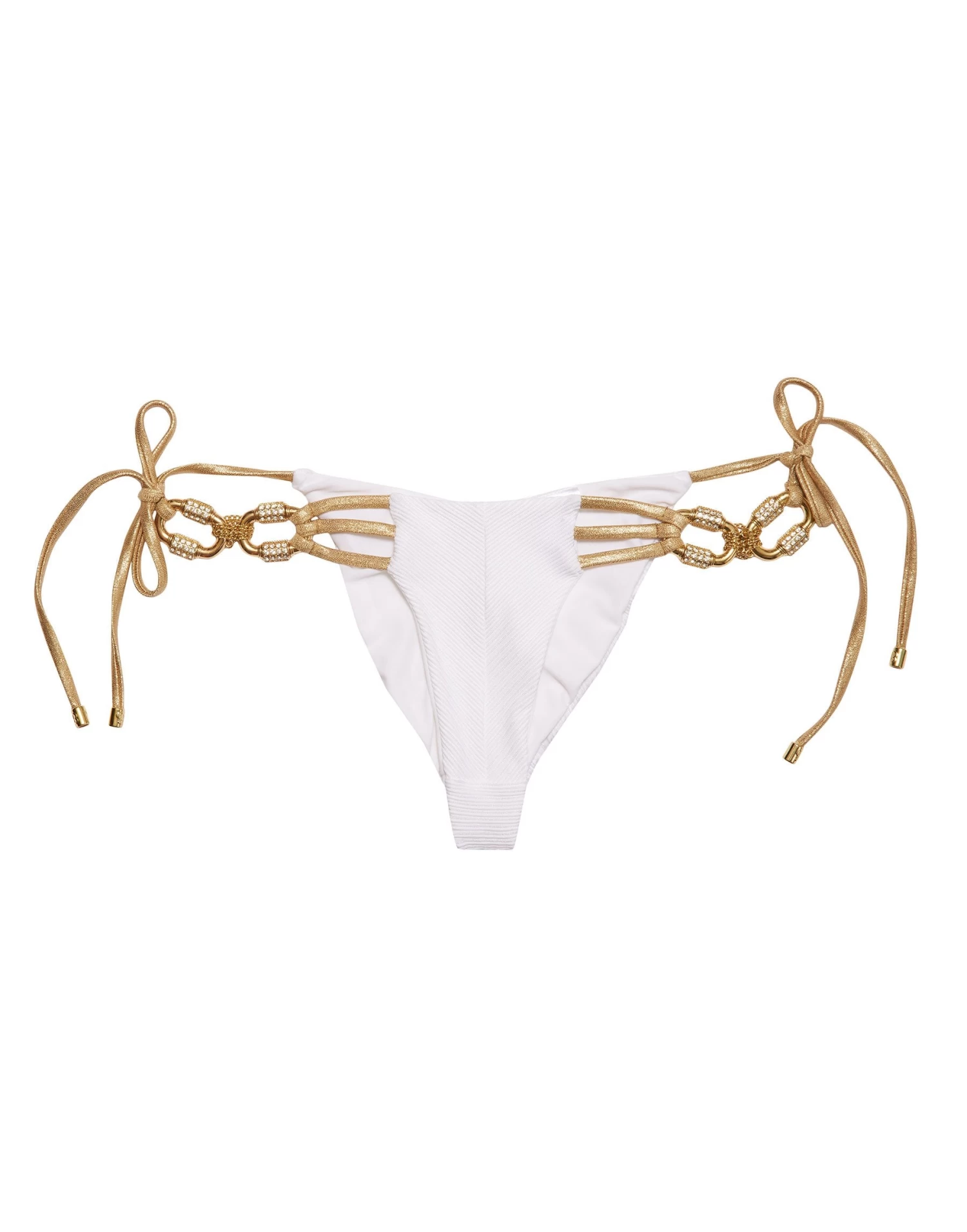 The Madagascar Glam bikini is a Beach Bunny classic. This tie side bottom has rhinestone embellished hardware and strappy details. Bound to be a go-to for your next Vegas trip!Â