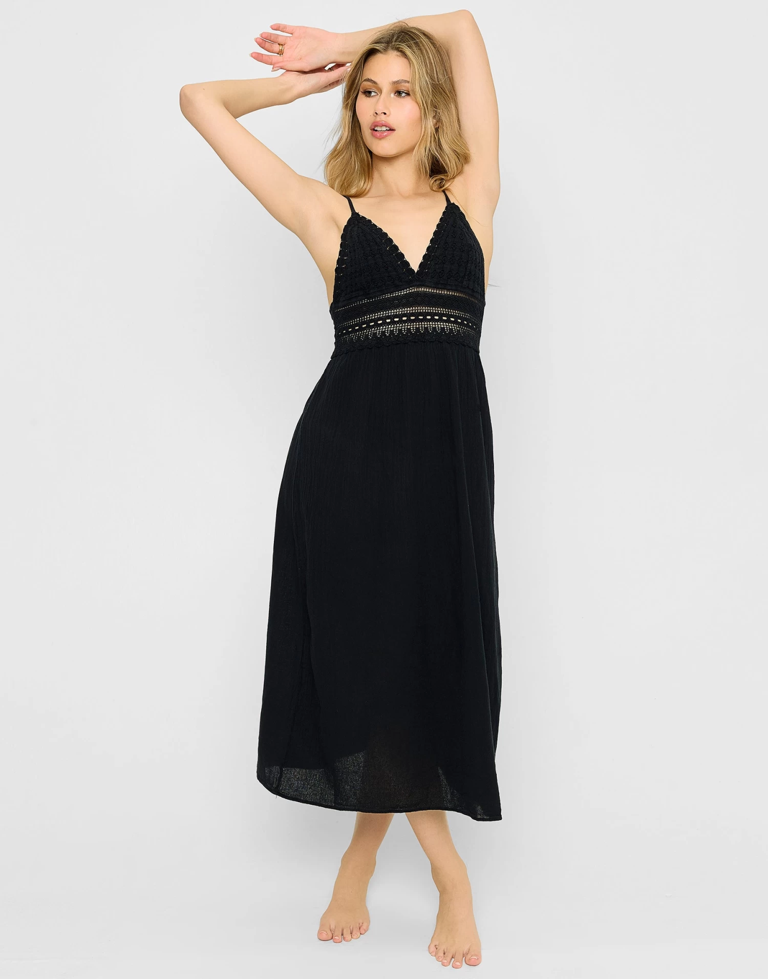 The Maya Dress offers a sophisticated style and an always elegant look. Its midi length provides an understated sense of elegance, and the open back with crochet detailing drapes elegantly and moves freely. Perfect for a special event or a night out.