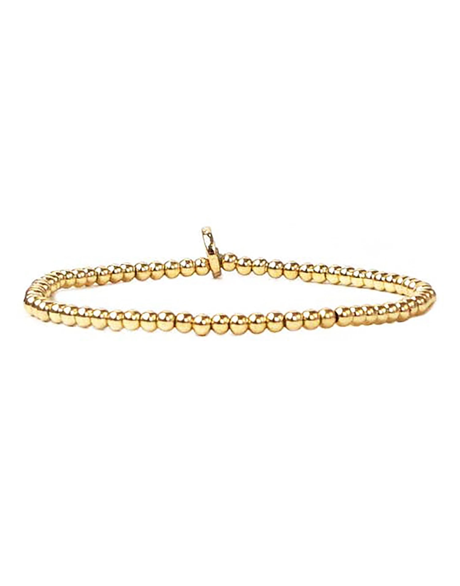 This metal beaded bracelet is crafted with a brass base and features 3 mm beads, resulting in an unstretched circumference of 6″.