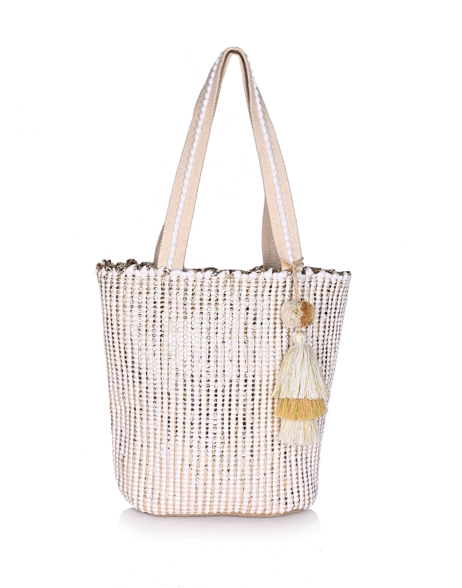 Multi-purpose tote, made by hand weaving fabric with lurex, double shoulder straps, pom pom tassel charm attached, hanging zip pocket attached inside, magnet button closure.