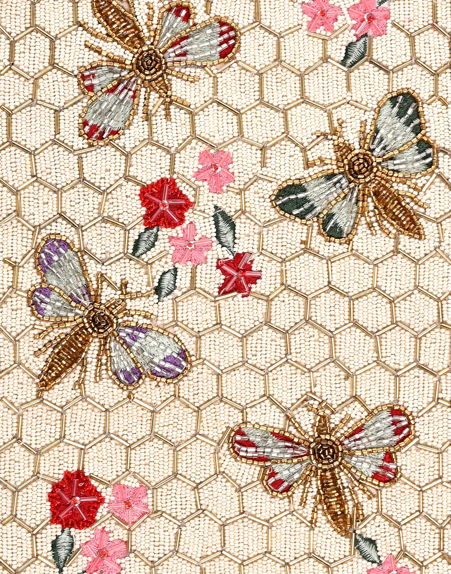 A hand beaded golden honey comb is home to the most gorgeous shimmering bees. Perhaps the rays of a sunrise are playing in the sky giving these bees shades of rose gold and moss green? Hand beaded stunning honey comb pattern with embroidered bees