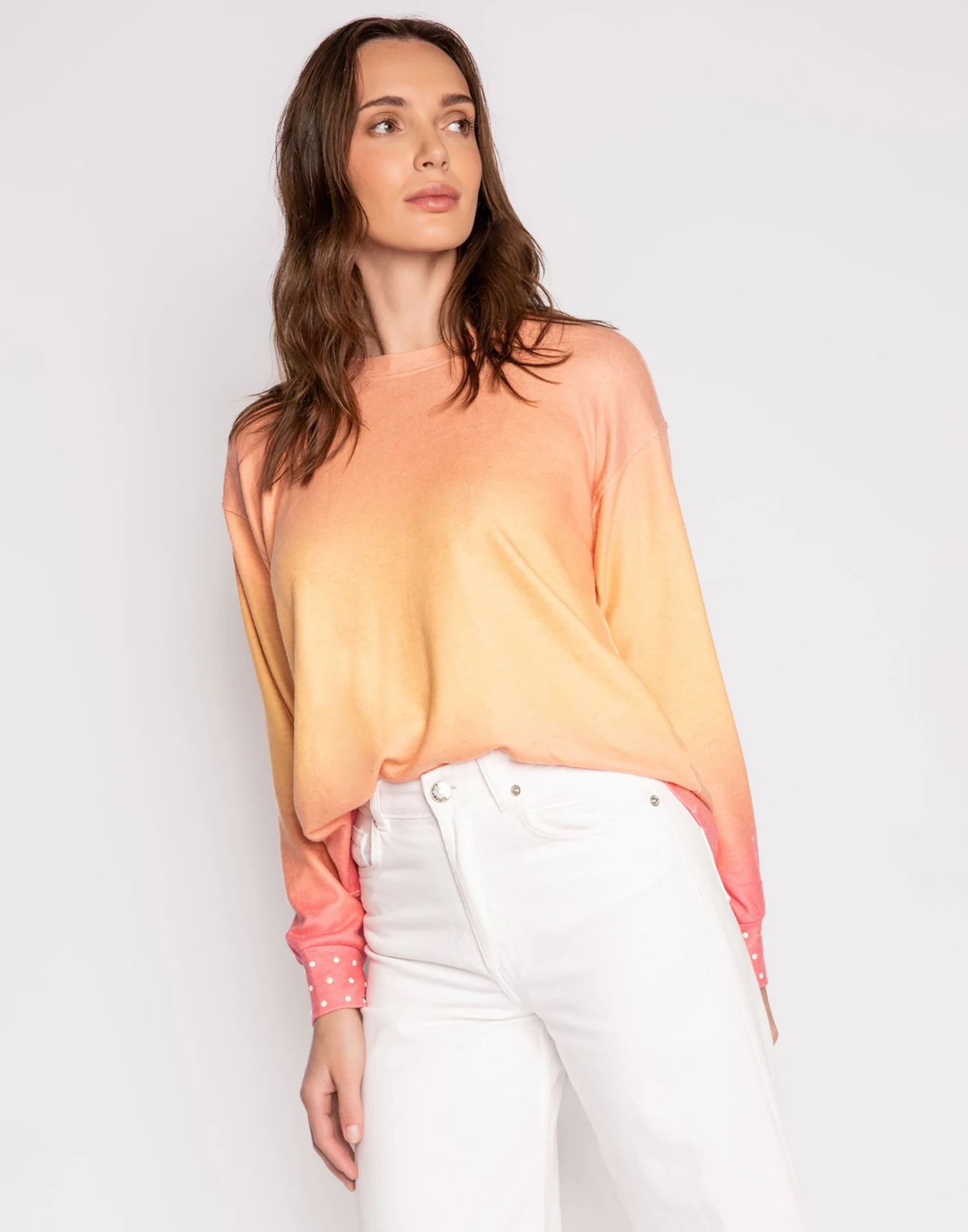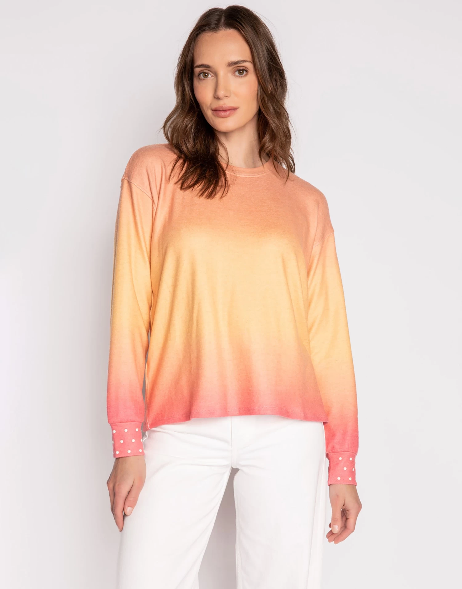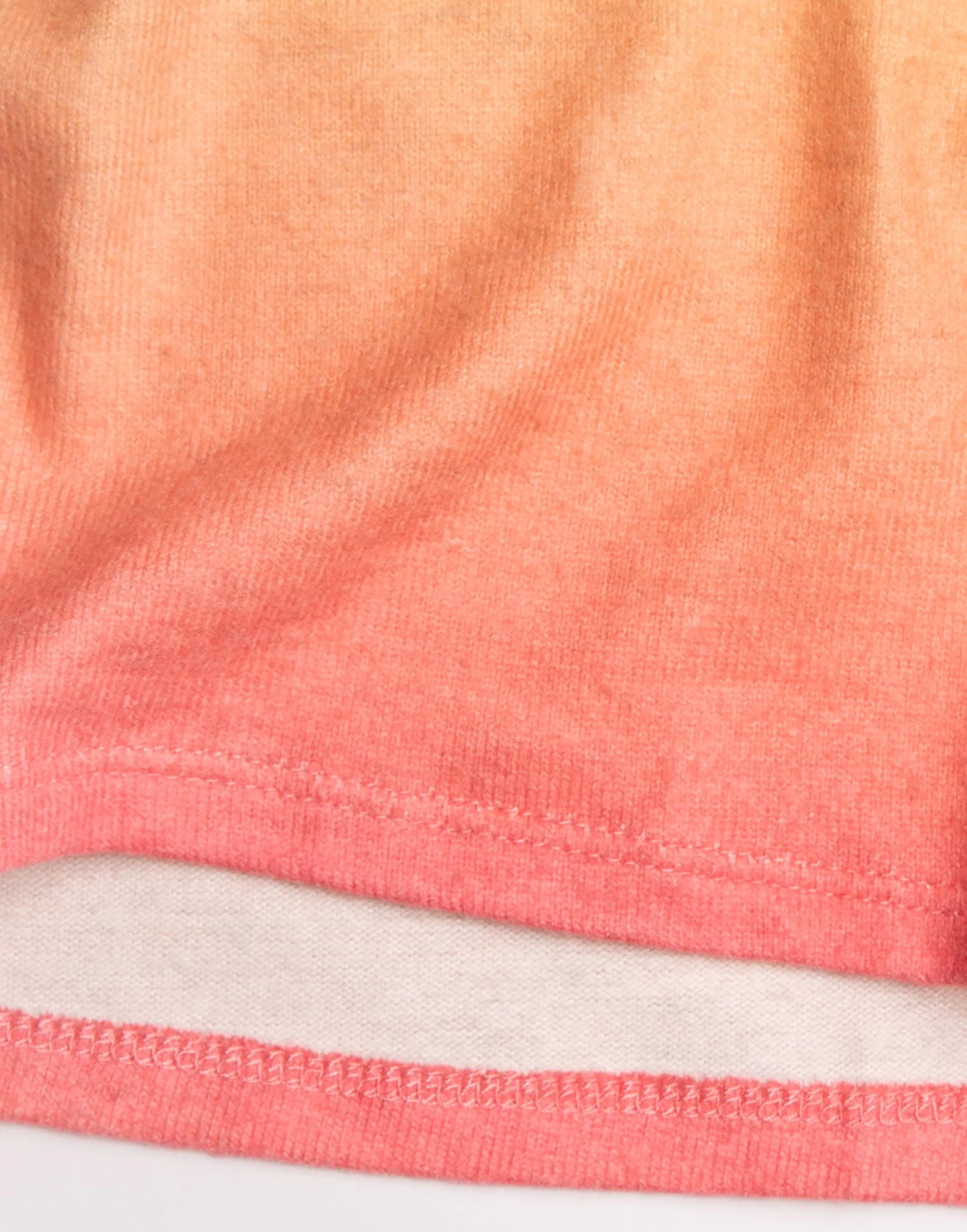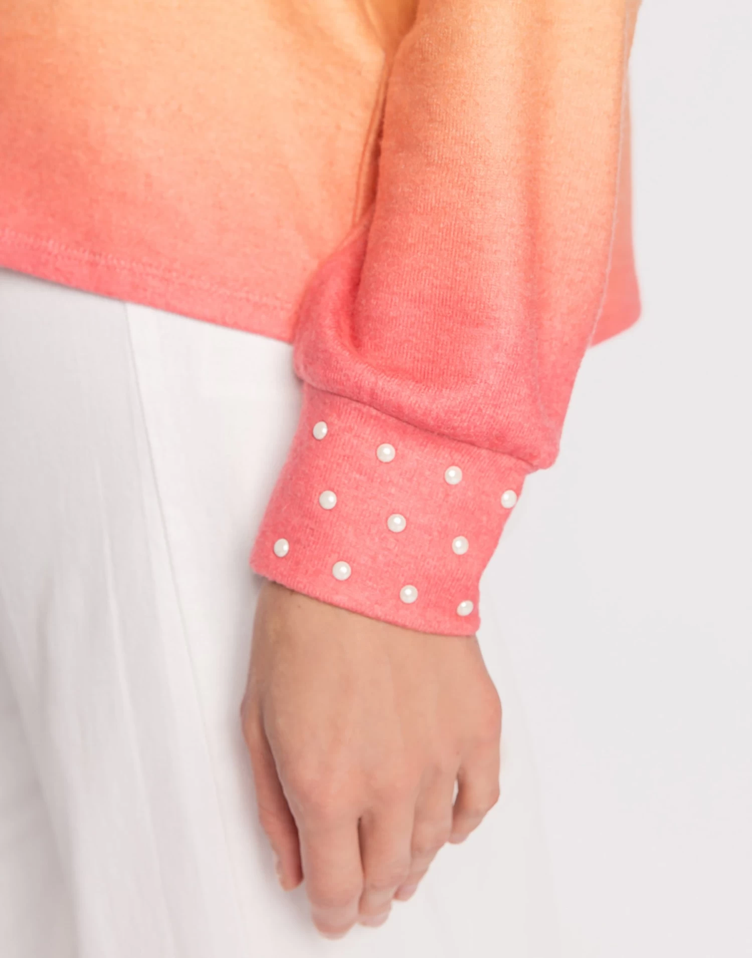 For anyone who loves a blazing, fiery sunset – this soft lounge top delivers. Ombre peach-coral dyed top with pearl-nailheads at cuffs.Â