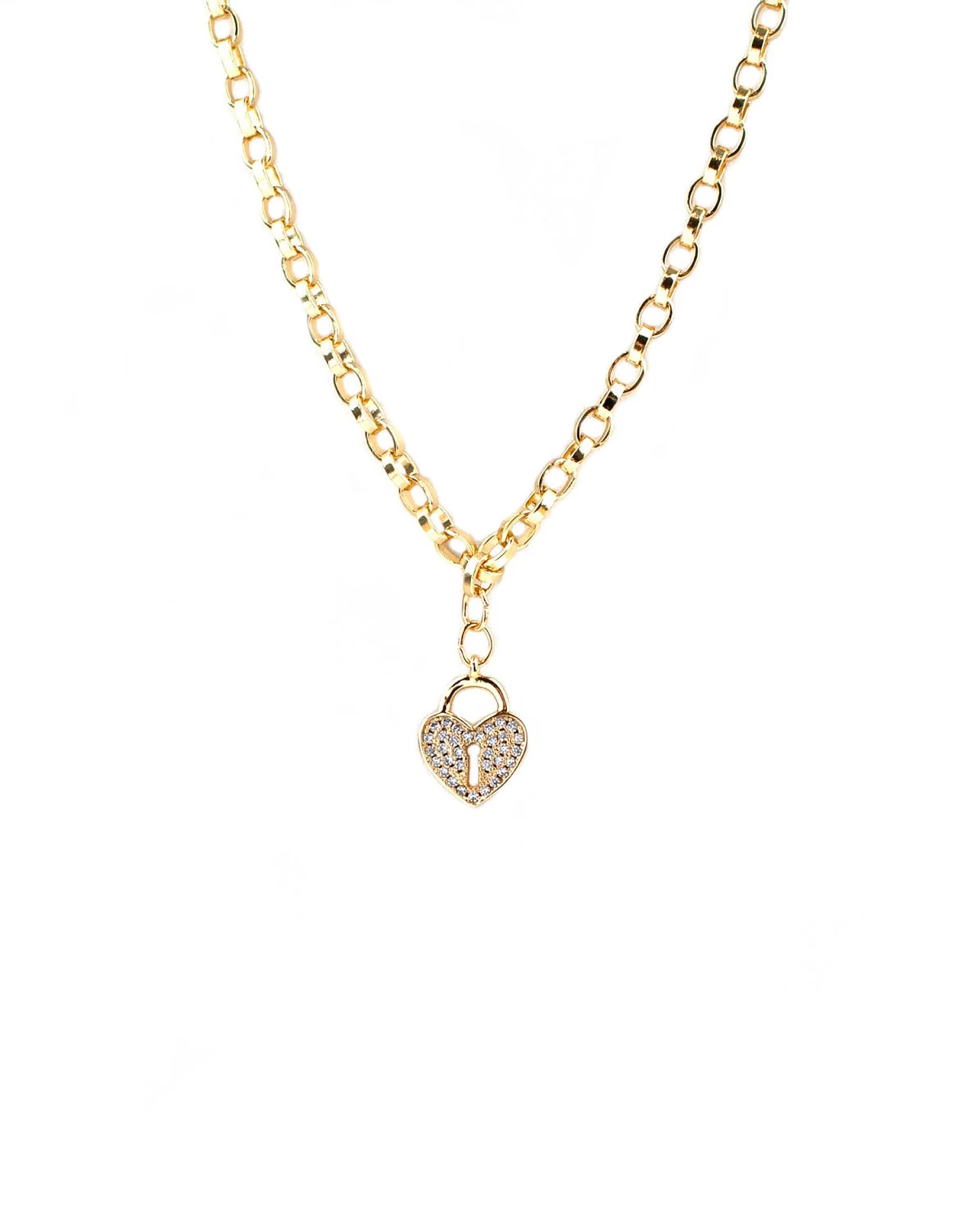 This Marlyn Schiff necklace features a heart-shaped locket adorned with pave stones, a linked chain, and a lobster claw clasp with a total length of 18″.