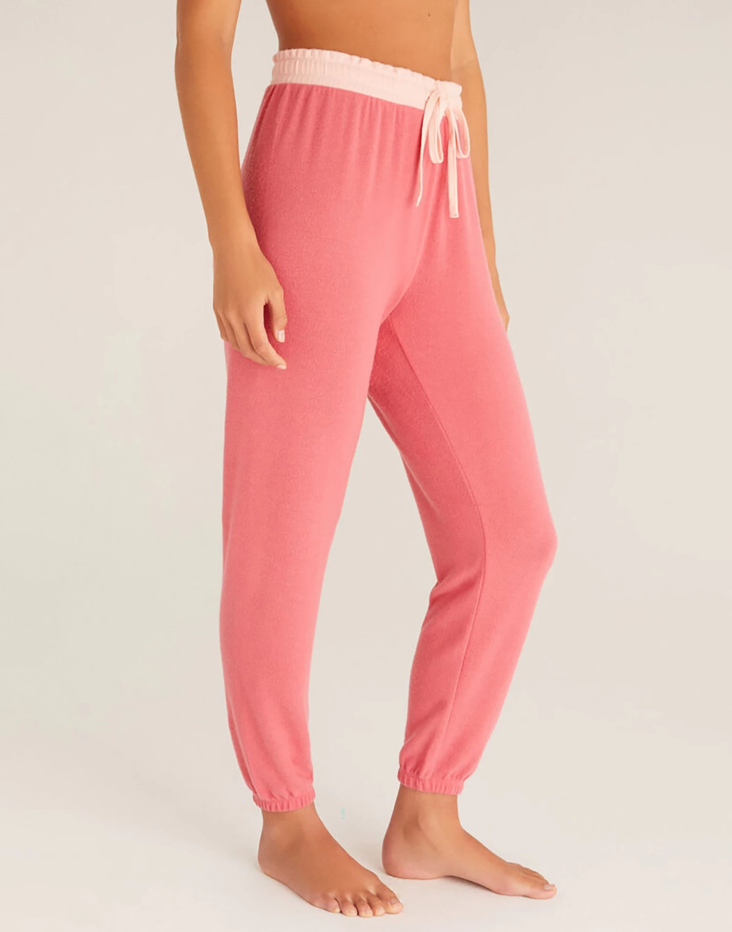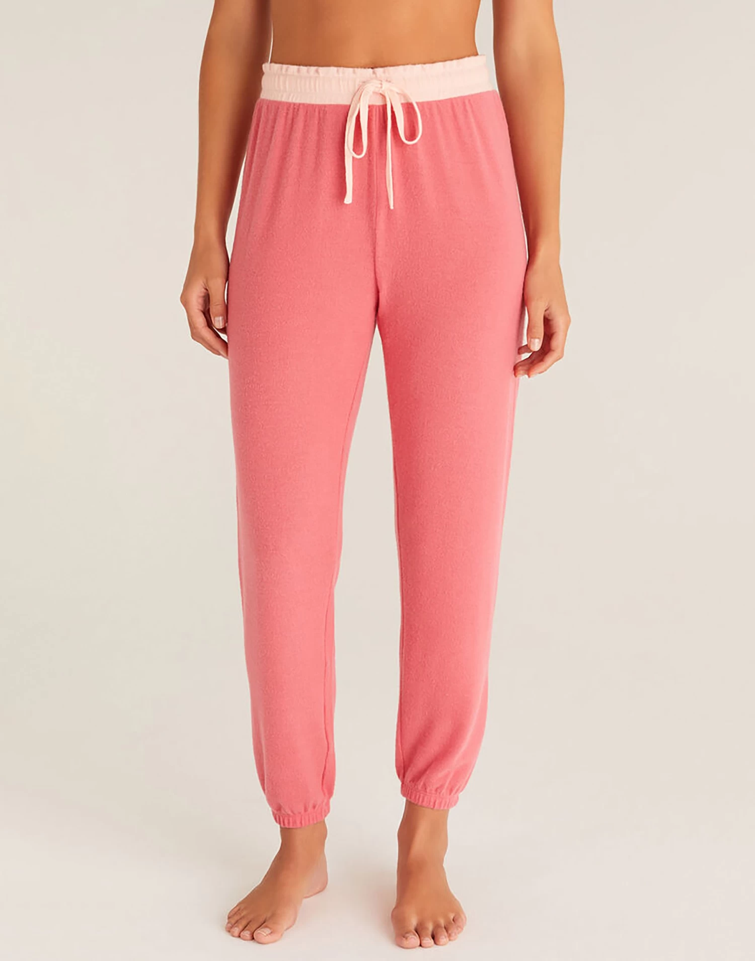 The Sweetie Brushed Jogger can be mixed with so many styles in this collection, but it matches perfectly with the Mix Color Tank Bra and Color Block Long Sleeve Top. Made using the same buttery soft Brushed Sweater Knit fabric, this tapered jogger features a drawstring waistband with ruffle detail and is comfy enough to wear all day.