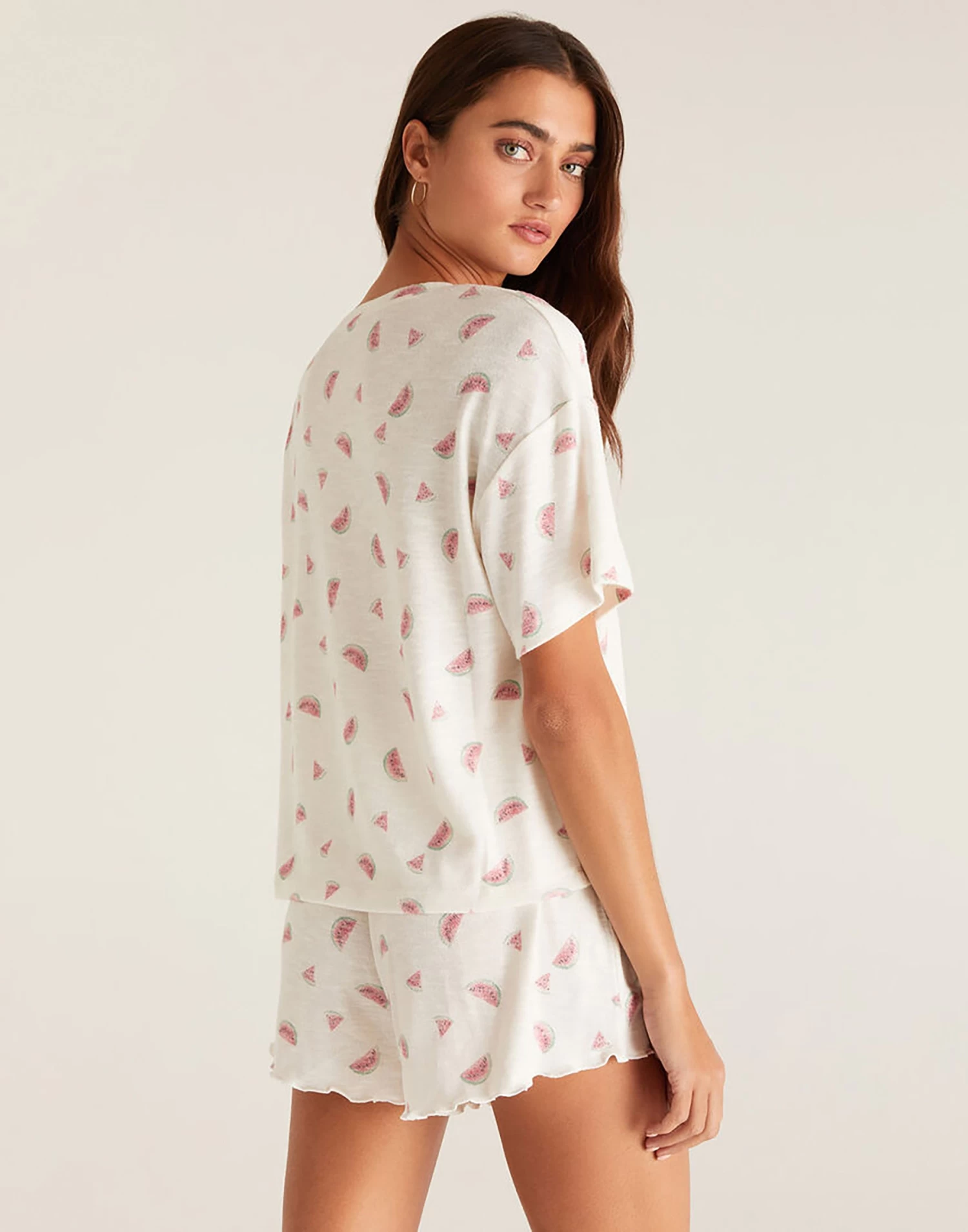 The Watermelon Sleep Set is just as comfy as it is cute. This summer-inspired sleep set features a relaxed v-neck top and relaxed Dawn Smocked Short with refreshing watermelon print in Slub Sweater Knit fabric.